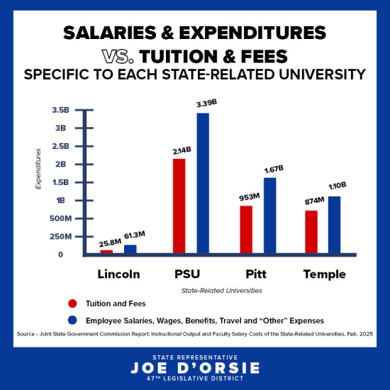 The Joint State Government Commission produces annual reports on the four state-related universities. After reading this year’s reports, I decided to dissect the numbers and translate them into easy-to-read graphs and charts. It is important to know how our tax dollars and tuition dollars are being spent in higher education, especially as we face workforce shortages, a dip in college enrollment, and an exodus of college graduates from Pennsylvania to states with more opportunity.